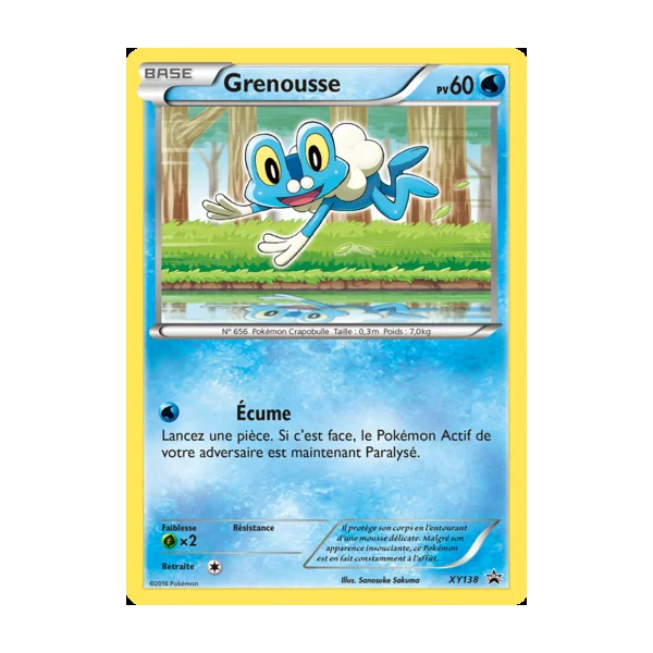 Découvrez Grenousse (xypr138), une carte Pokémon de l’extension Promos XY, provenant du bloc XY. Idéale pour compléter votre collection, cette carte Promo plaira autant aux collectionneurs qu’aux joueurs.