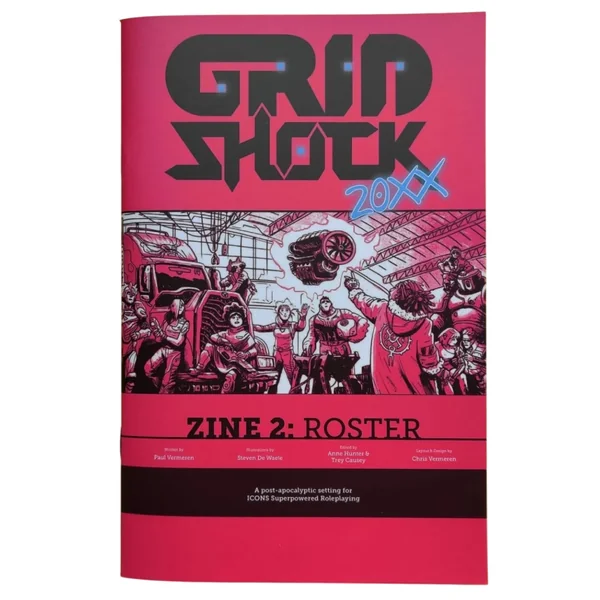 Un aperçu du monde, des thèmes et du style de jeu de GRIDSHOCK 20XX, avec des règles optionnelles pour traverser la Thunder Road dans votre Motorig et vous préparer pour l’action surpuissante. - GRIDSHOCK 20XX ZINE 2 : ROSTER