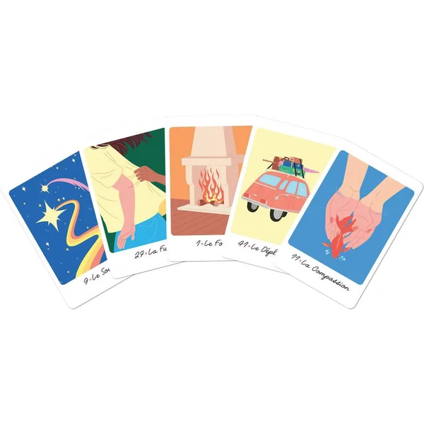 Jeu de 55 cartes au format poker et packaging compact, pratique à emporter partout avec soi pour des tirages nomades ou lors de rendez-vous entre amis. Des vidéos d’initiation et pratique de l’oracle et des cartes de synthèse vous permettent une prise en main immédiate du jeu.