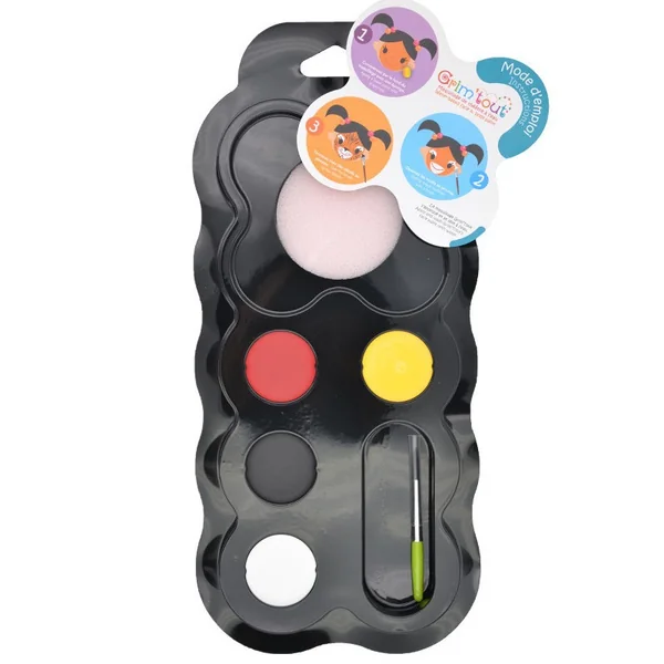 GRIM’TOUT est un maquillage de théâtre à l’eau de qualité spécialement conçu pour convenir aux peaux délicates des enfants. Toujours dilué à l’eau, il s’applique simplement à l’aide d’une éponge ou d’un pinceau !