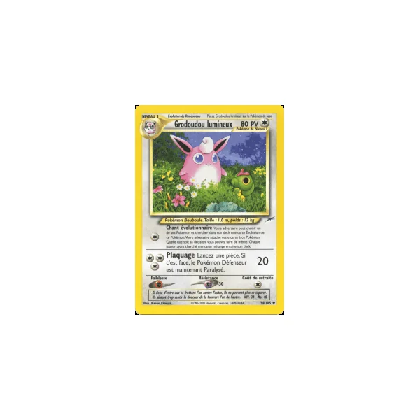 Découvrez Grodoudou lumineux (nde054), une carte Pokémon de l’extension Neo Destiny, provenant du bloc Wizards. Idéale pour compléter votre collection, cette carte Peu Commune plaira autant aux collectionneurs qu’aux joueurs.