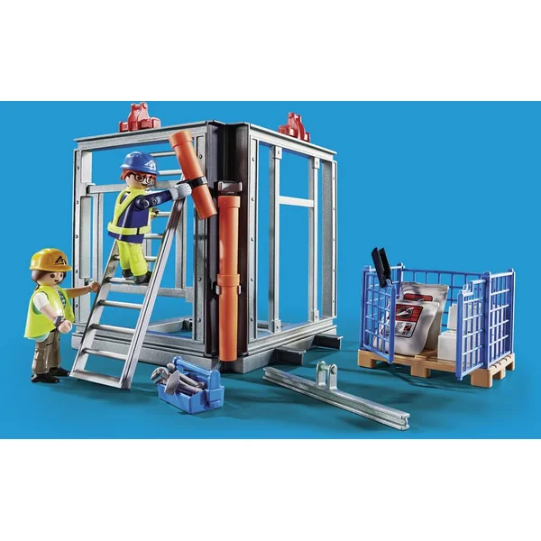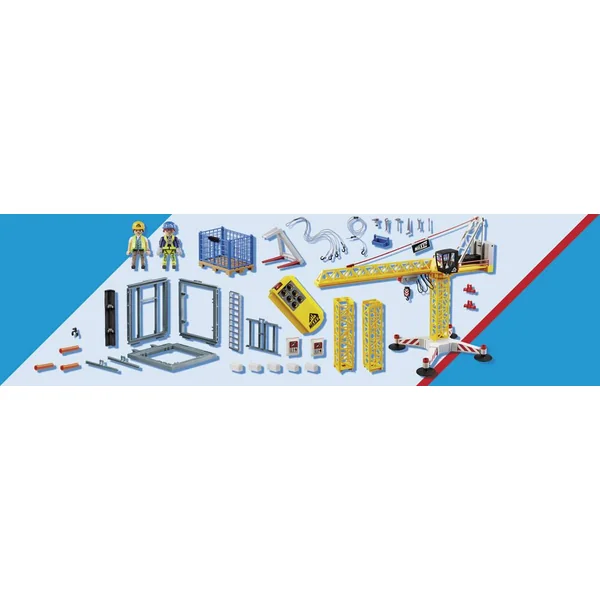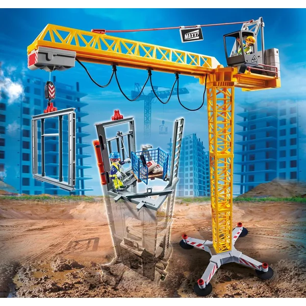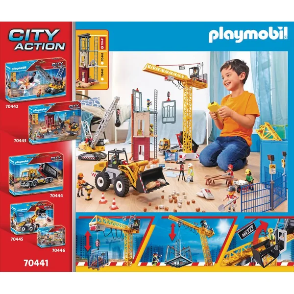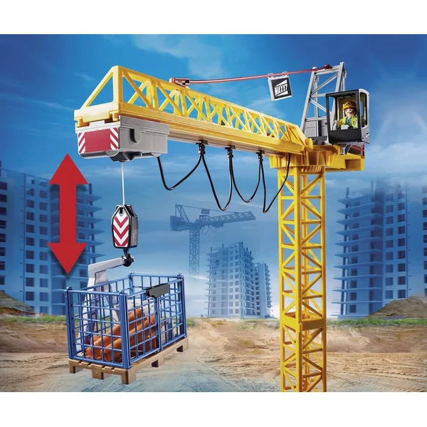 Le chantier progresse rapidement. Avec de la chance, on aura fini à temps ! La grue transporte les éléments du bâtiment grâce à son palan qui s’oriente de la droite vers la gauche et de haut en bas. Contient 2 personnages, (1 module RC), 1 structure de bâtiment et des accessoires.