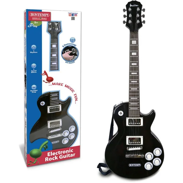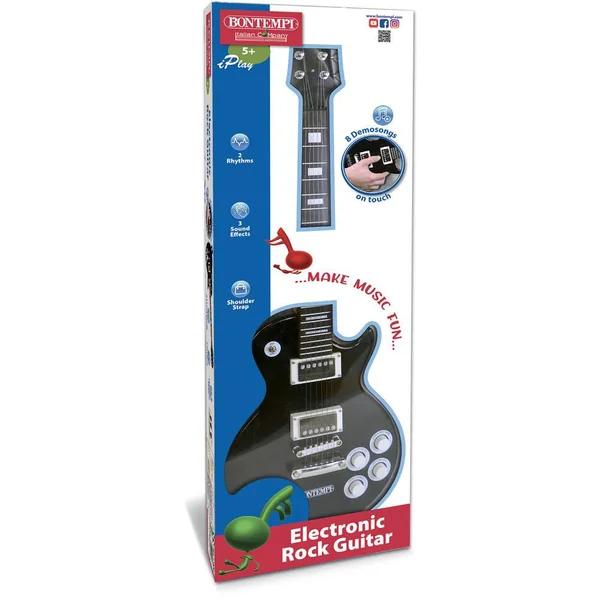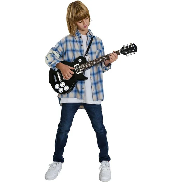 Apprenez à connaître le monde de la musique avec cette guitare électrique. Avec cette guitare cool, tu peux jouer tes propres belles chansons et tu peux l’emmener partout. La guitare dispose de huit morceaux de démonstration, de deux rythmes, de trois effets sonores et d’un réglage du volume. Idéal comme premier instrument pour un musicien en herbe ! Nombre d’effets sonores : 8 -Nombre d’effets sonores 3 -Nombre de rythmes : 2 -Volume réglable : oui – 1 Guitare
