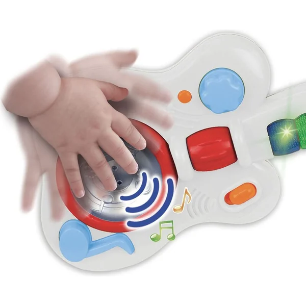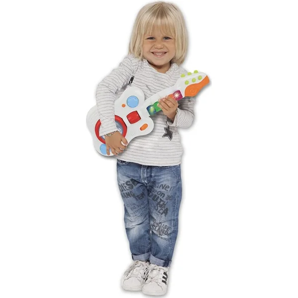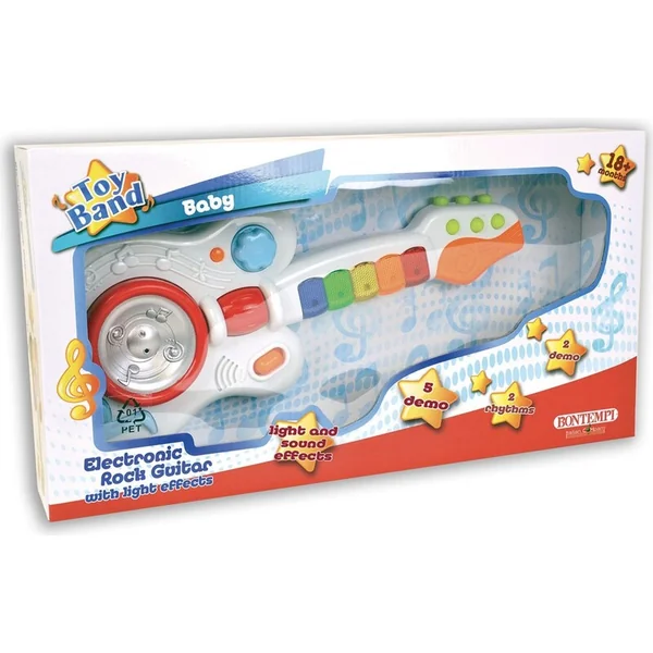 Guitare rock pour enfants • 5 notes musicales • 6 pauses musicales • 5 démosongs avec un jeu de clavier aléatoire • 1 chanson • Vous pouvez changer 6 pistes d’accompagnement rock et 4 rythmes de batterie simplement en passant la main devant les capteurs • Effets lumineux • Alimentation : 3 piles R6 / AA 1,5V (non incluses) • Dimensions : 170x400x50 mm