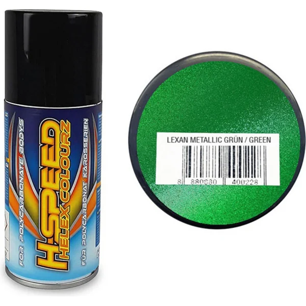 La peinture acrylique en spray H-Speed vert métallique est adaptée à une large gamme de matériaux (plastiques sauf nylon, métaux, bois, verre, céramique, papier, EPP, EPS). Les peintures ne provoquent pas de corrosion du lexan ! Les peintures acryliques sèchent rapidement, couvrent parfaitement et sont résistantes aux rayures.