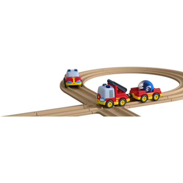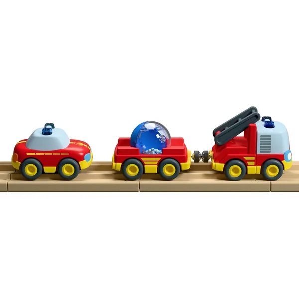 Ce set d’action comprend deux robustes voitures de pompiers avec un moteur à inertie – entièrement sans batteries – et une remorque avec attelage magnétique.