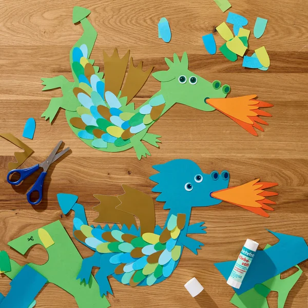 Le processus est simple : d’abord, on découpe les parties du corps comme les ailes et le corps, puis on sélectionne les écaille prédécoupées et on les colle à leur place – et enfin, le dragon entier est décoré avec des autocollants.