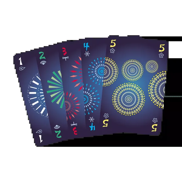 Hanabi est un jeu coopératif, c’est-à-dire un jeu dans lequel les joueurs ne s’affrontent pas mais font équipe pour atteindre un objectif commun. Ils interprètent ici des artificiers distraits qui ont mélangé par mégarde les poudres, mèches et fusées d’un grand feu d’artifice. La représentation va commencer et c’est un peu la panique. Il leur faudra s’entraider pour que le spectacle ne tourne pas à la catastrophe ! Le but des artificiers est de composer 5 feux d’artifice, un de chaque couleur (blanc, rouge, bleu, jaune, vert), en constituant des suites croissantes (1, 2, 3, 4, 5) avec des cartes de même couleur.
