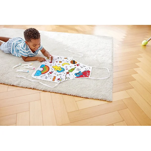 Ce tablier est livré avec un ensemble de six feutres : vert, rouge, jaune, orange, bleu et noir. Le tablier est imperméable pour protéger les œuvres d’art de votre enfant des taches et des éclaboussures.