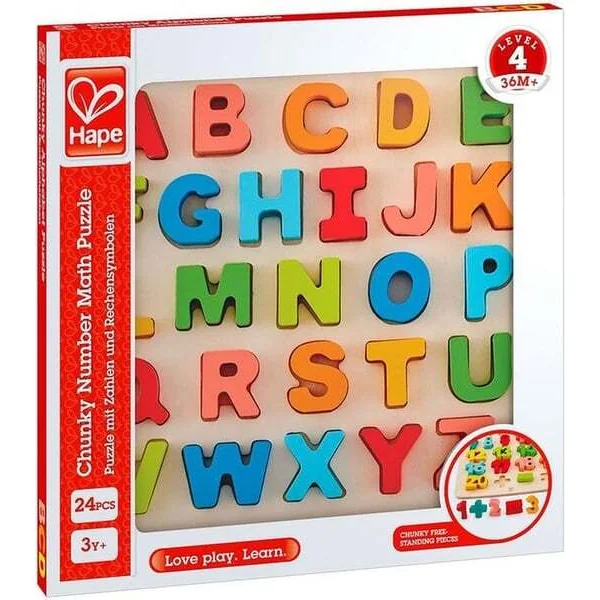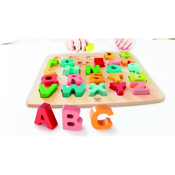 L’alphabet coloré est un thème pour un puzzle à encastrer. Les enfants peuvent insérer les lettres dans les découpes appropriées sur la base. En dehors de la base, les enfants peuvent former la première syllabe et des mots simples avec les lettres.