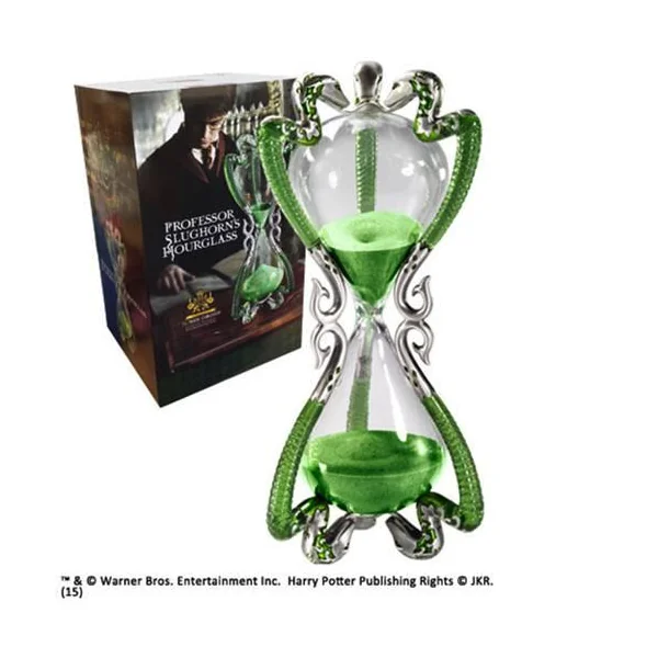 Réplique du sablier d’Horace Slughorn vu dans le film « Harry Potter », taille environ 25 cm. Il est fabriqué en étain, métal « die cast », ABS transparent et émail. L’écoulement du sable dure environ 1 heure.