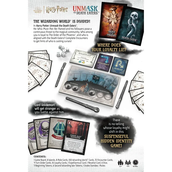 Le monde des sorciers est divisé – êtes-vous loyal envers l’Ordre du Phénix, ou êtes-vous aligné avec les Mangemorts ? Dans Harry Potter®: Unmask the Death Eaters, la tromperie est présente à chaque coin de rue alors que la communauté magique est à la merci de Celui-Dont-On-Ne-Doit-Pas-Prononcer-Le-Nom et de ses partisans. Mais partir au combat demandera de la vigilance, surtout avec des malédictions lancées en secret par ceux parmi vous. En prenant les rôles de la communauté magique, travaillez ensemble pour découvrir où se trouvent les loyautés et vaincre Lord Voldemort™ pour gagner !