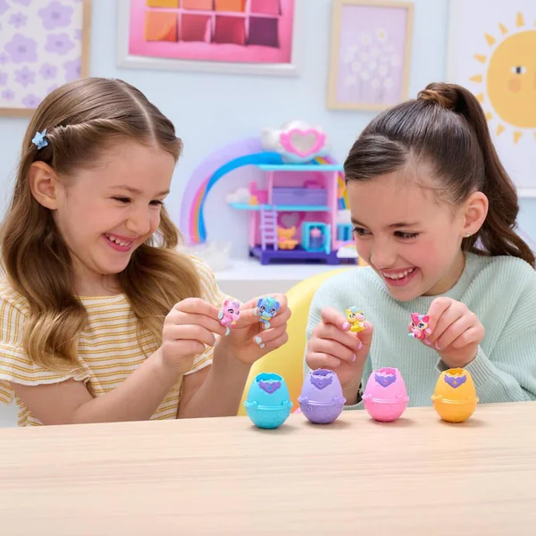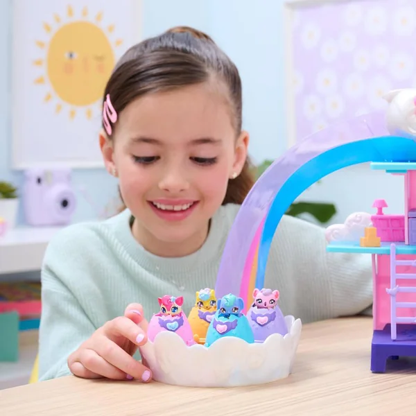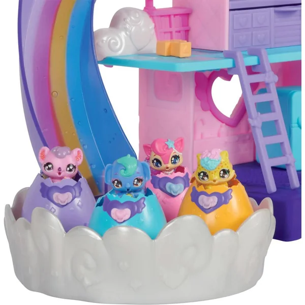 Les nouvelles figurines Hatchimals à Collectionner avec une nouvelle éclosion magique. Cette maison des Hatchimals est un véritable univers de jeu avec un salon, une chambre, un coin cuisine et un toboggan.Place tes oeufs Hatchimals dans la petite piscine puis verse de l’eau dans le toboggan pour les faire éclore. Dans chaque œuf se cache un Hatchimals, une petite créature mignonne. Tu peux également utiliser le biberon inclus pour faire éclore les oeufs et découvrir ta figurine.Coffret comprenant 4 Hatchimals à Collectionner et 12 accessoires.