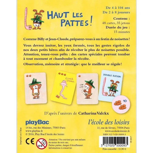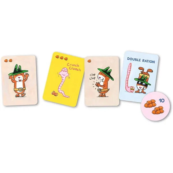 Vous devrez imiter, les yeux fermés, tous les gestes rigolos de nos deux petits héros afin de récolter le plus de noisettes possible. Attention, tenez-vous prêts : des cartes spéciales peuvent tomber à tout moment et chambouler la récolte. Observation, mémoire et stratégie : que le meilleur se régale !