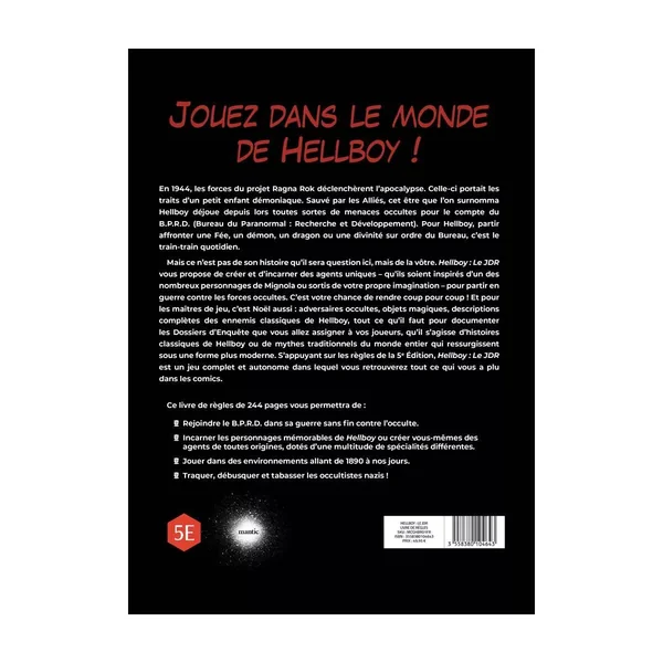 C’est l’occasion pour vous de frapper un grand coup ! Et pour les maîtres de jeu, nous sommes là aussi pour vous. Avec des ennemis occultes, des artefacts et des descriptions complètes des ennemis classiques de Hellboy, vous pourrez emmener vos joueurs à travers une variété de dossiers, qu’il s’agisse d’histoires classiques de Hellboy ou de réécritures modernes de mythes du monde entier.