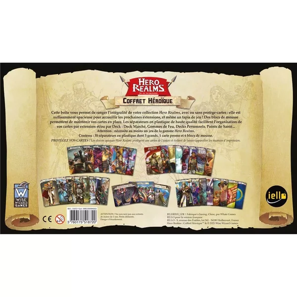 Ce coffret Héroïque Hero Realms inclut 32 Séparateurs plastiques pour faciliter l’organisation de vos cartes par extension et/ou par Deck, 6 blocs de Mousse pour vous permettre de maintenir vos cartes en place et 1 Carte Promo.