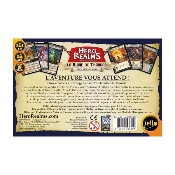 Chaque joueur (de un à cinq) débute la partie avec un Deck de Héros qui s’enrichit progressivement de fabuleux trésors et de puissants objets magiques ! Après chaque chapitre, les joueurs remportent des points d’expérience qui peuvent être dépensés pour acquérir de nouvelles compétences et capacités. Si les Héros parviennent au bout de la campagne, ils n’en auront pas pour autant fini avec Thandar, loin de là ! Il sera possible de redécouvrir La Ruine de Thandar en mode Joueur contre Joueur, voire de s’unir pour affronter un adversaire unique doté d’un deck amélioré, ou de combiner Ruine de Thandar et Decks de Boss pour des affrontements épiques ! La Ruine de Thandar est le premier chapitre d’une série d’extensions qui vous invite à explorer l’univers d’Hero Realms d’une manière totalement inédite, coopérative et passionnante !