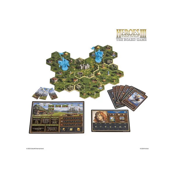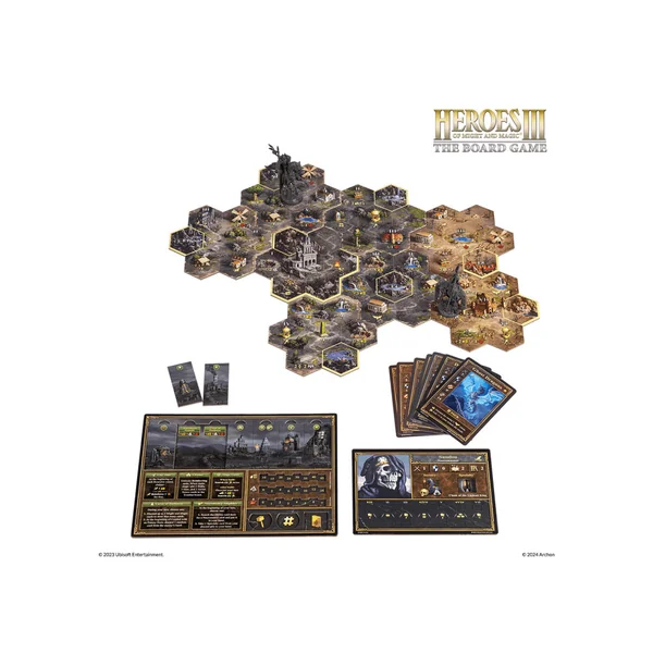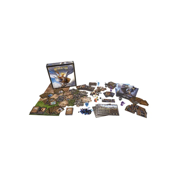 Heroes of Might and Magic III – Le Jeu de Société comprend des scénarios compétitifs, coopératifs et solitaires pour combattre et explorer. Les cartes d’aventure sont représentées par des tuiles, chaque tuile étant divisée en sept champs hexagonaux.