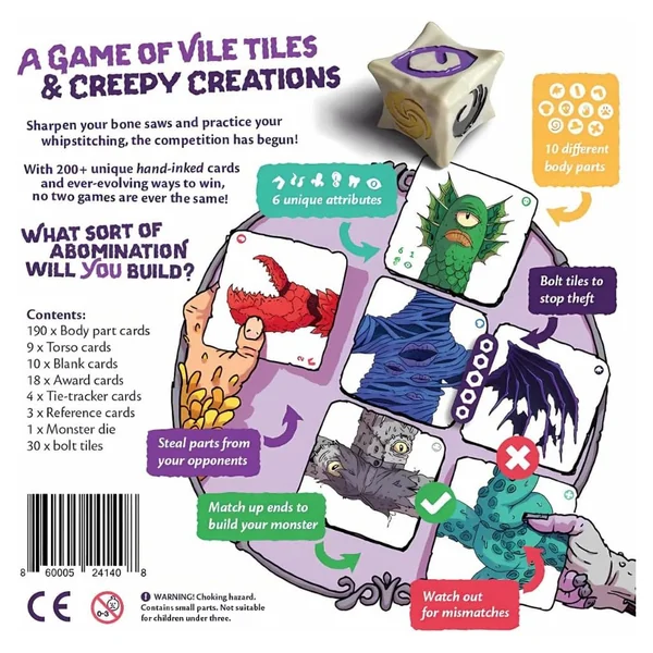 Aiguisez vos scies à os et entraînez-vous au point de suture : la compétition est lancée ! À tour de rôle, posez des tuiles représentant des parties de corps pour assembler votre propre monstre, en cherchant à obtenir les caractéristiques les plus convoitées et à remporter le plus de trophées. Avec des conditions de victoire aléatoires et plus de 200 parties de corps uniques dessinées à la main, aucune partie ne se ressemble. Qui saura insuffler la vie à la monstruosité la plus répugnante et la plus étrange ?
