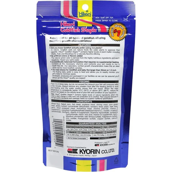 Hikari Staple baby pellet est un aliment flottant qui ne trouble pas l’eau. L’aliment flottant permet d’observer et d’ajuster plus facilement la quantité de nourriture, évitant ainsi le suralimentation.