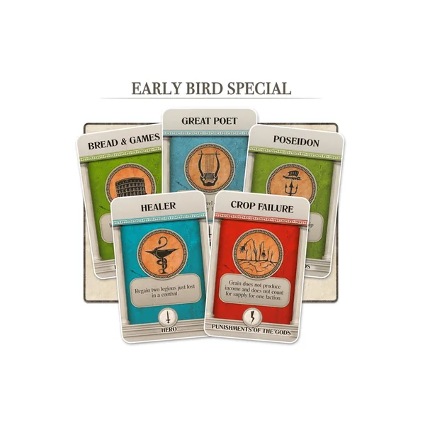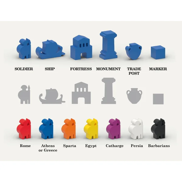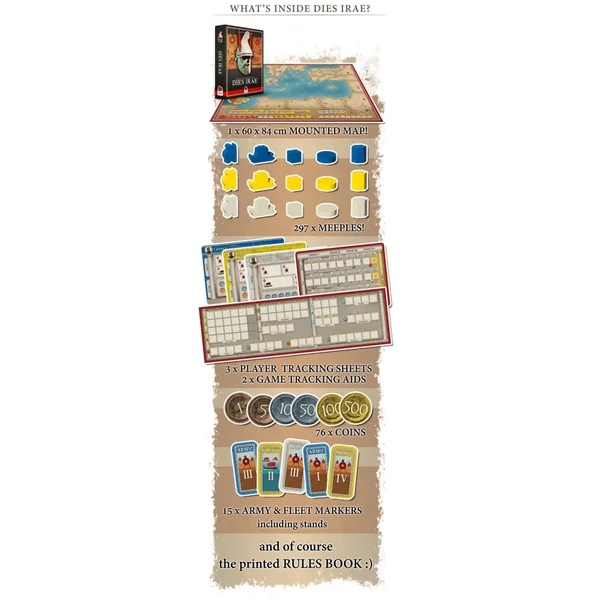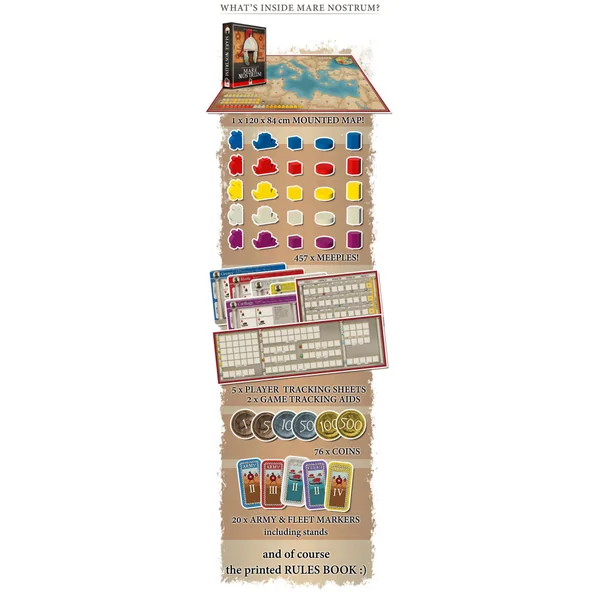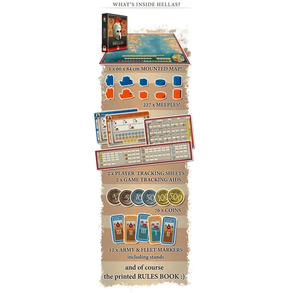 History of the Ancient Seas – Wooden Box contient les 3 jeux de la gamme, plus les extensions New Armies, Barbarians and Pirates et New Markets, les sacs en coton ainsi que les stretch goals débloqués dans la campagne, le tout dans une superbe boîte en bois.
