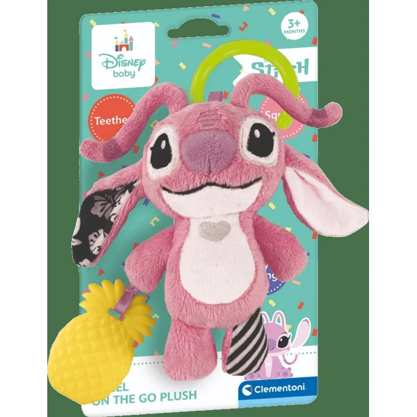 Jouet en peluche adorable Stitch avec de nombreuses activités : oreilles bruissantes, deux accessoires en plastique souple à mâcher et un hochet à l’intérieur de la peluche. Un clip pratique facilite l’accrochage partout.