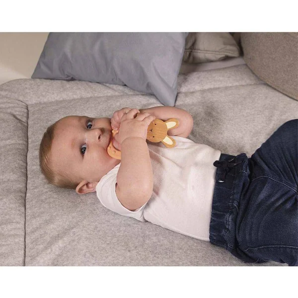 Cet anneau de dentition en silicone avec picots en relief est accompagné d’un petite tête de lapin en bois.