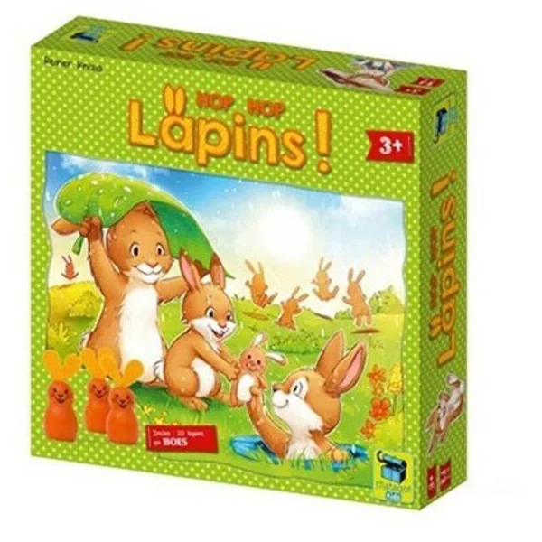C’est un beau jour d’été, la chaleur est au rendez-vous… mais la pluie se met à tomber. Le terrier se remplit d’eau et les petits lapins ont les pieds trempés. Ils courent vers une des cinq sorties de couleur menant à la surface. la boîte de jeu (24 x 24 cm) sert de terrier, 1 dé 5 couleurs avec une face lapin, 20 lapins en bois avec de grandes oreilles en feutrine résistante (ht 5 cm), règles et variantes. Nombre de joueurs 2 à 5. Durée de la partie 15 minutes.
