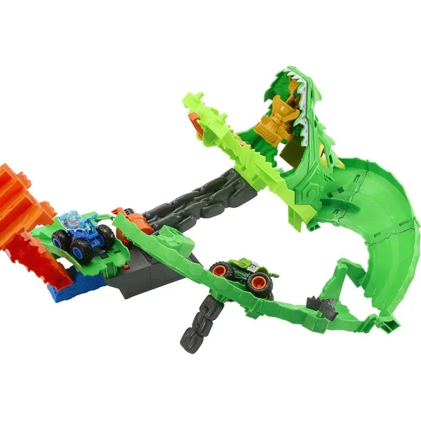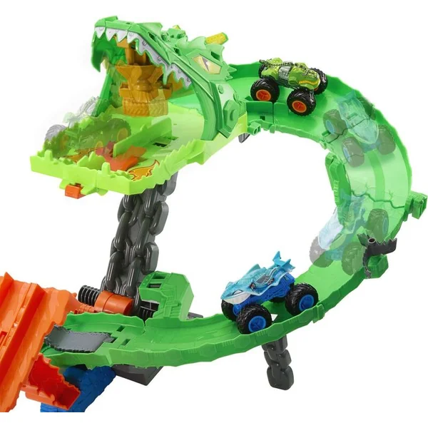 Les Monster Trucks Hot Wheels s’affrontent pour vaincre le dragon dans la course Sharks vs. Dinosaur Dragon Race. Placez les voitures fournies dans les lanceurs doubles, puis envoyez-les côte à côte vers les mâchoires du dragon cyborg. Les camions passent par la piste du dragon, où un interrupteur en forme de scie choisit aléatoirement l’un des trois résultats : arrêter les deux véhicules, en envoyer un hors de la piste ou laisser les deux passer pour vaincre le dragon. Lorsque le dragon est mis à terre, les enfants peuvent lancer la voiture dans sa gueule et remporter un trophée.