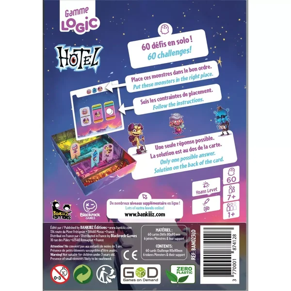 Les défis de Hotel, issu de la Gamme Logic Bankiiiz, sont basés sur les demandes de placement des clients monstrueux de l’hotel. Tous ont des demandes particulières qu’il faudrait remplir dans le but de trouver l’unique solution à chaque défi.