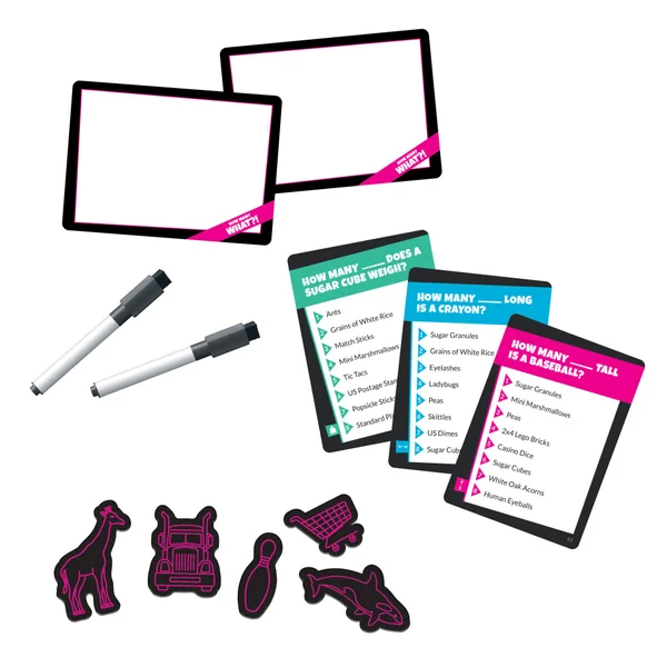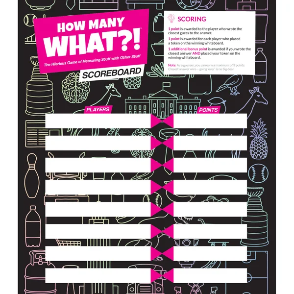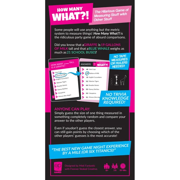 How Many What?! est un jeu d’ambiance complètement absurde basé sur des comparaisons improbables. Tout le monde peut jouer : il suffit d’estimer la taille ou le poids de quelque chose mesuré dans une unité totalement farfelue, puis de comparer votre réponse à celles des autres joueurs. Classez les réponses dans l’ordre et votez ! Même si vous n’avez pas l’estimation la plus proche, vous pouvez quand même marquer des points en votant pour la réponse que vous jugez la plus précise.