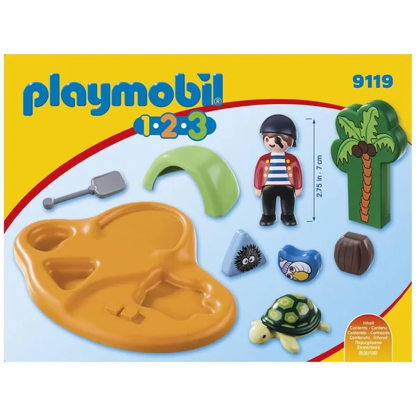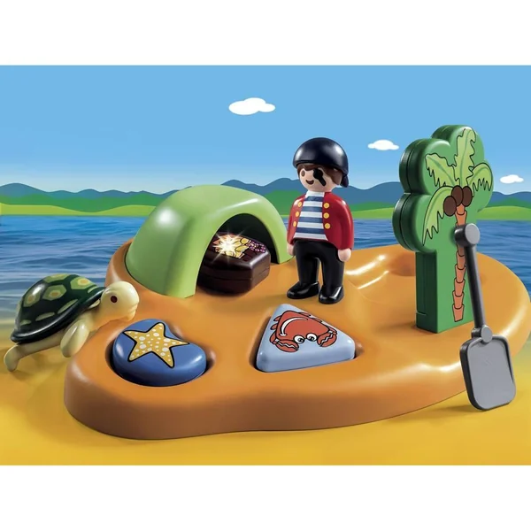 L’île des pirates PLAYMOBIL® 1.2.3 ne sert pas seulement de refuge au capitaine ; c’est également là, dans la grotte, qu’il a dissimulé son trésor. D’amusants animaux marins peuvent être rangés dans les creux du plateau de jeu. Les tortues de mer viennent jeter un oil de temps en temps. Avec une grotte au trésor et un jeu de formes. La tortue flotte. PLAYMOBIL® 1.2.3 – les tout petits voient grand ! Les PLAYMOBIL 1.2.3 sont colorés avec des formes arrondies, ils aident les enfant à se développer et à apprendre en jouant. Les pièces du puzzle, la tortue et la colonne peuvent être rangées dans les creux prévus à cet effet dans le plateau de jeu. Les pièces du puzzle sont imprimées sur leurs deux faces avec des motifs différents : pièce triangulaire : oursin/crabe; pièce ovale : escargot/étoile de mer; pièce ovale : tonneau/tonneau ouvert laissant apparaît le trésor. La boîte contient 1 île, 1 personnage, 1 trésor et de nombreux accessoires.
