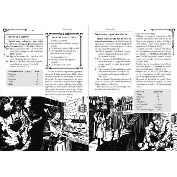 Impitoyables bourgades copie la recette qui a fait d’En terres sauvages un succès. C’est-à-dire qu’il ne contient que des consignes simples et souples et des tables aléatoires utiles et inspirantes. Son approche des Localités, Factions et PNJs, de leurs relations et interactions est pragmatique et parlante. Bref, c’est le supplément idéal pour préparer ou improviser des aventures en milieu urbain. Du haut potentiel ludique, quoi !
