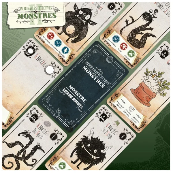 - 14 Cartes de Monstres avec leurs empreintes de pattes, leur valeur de Peur et leurs Capacités spéciales (ceux du livre de base d’Incroyables Détectives de Monstres + 3 Gamusinos)