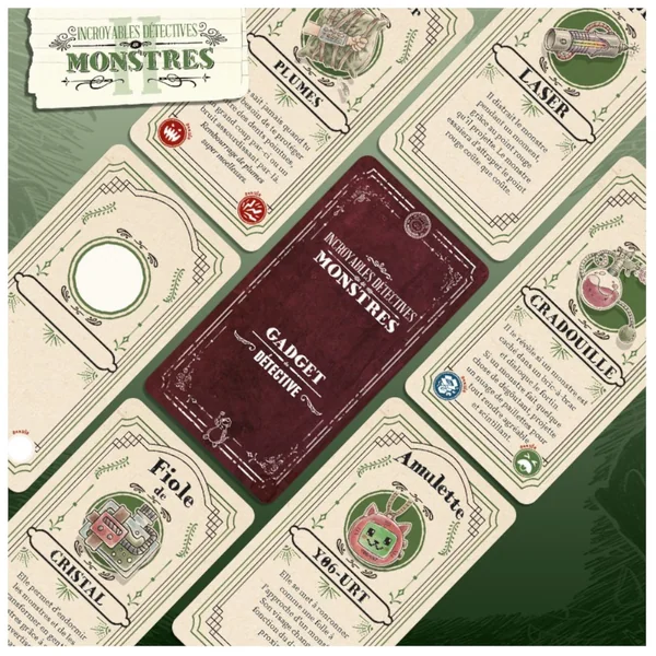 - 12 Cartes de Gadgets avec les Capacités des Monstres qu’ils annulent le cas échéant (ceux du livre de base d’Incroyables Détectives de Monstres)