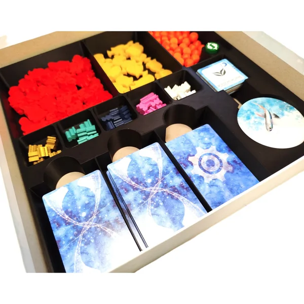 Conçu spécialement pour le jeu Finspan, cet insert optimise le rangement de toutes les pièces du jeu : tuiles, pions et cartes (avec ou sans sleeves), le tout dans une seule boîte. Chaque compartiment a été pensé pour une installation rapide et efficace.
