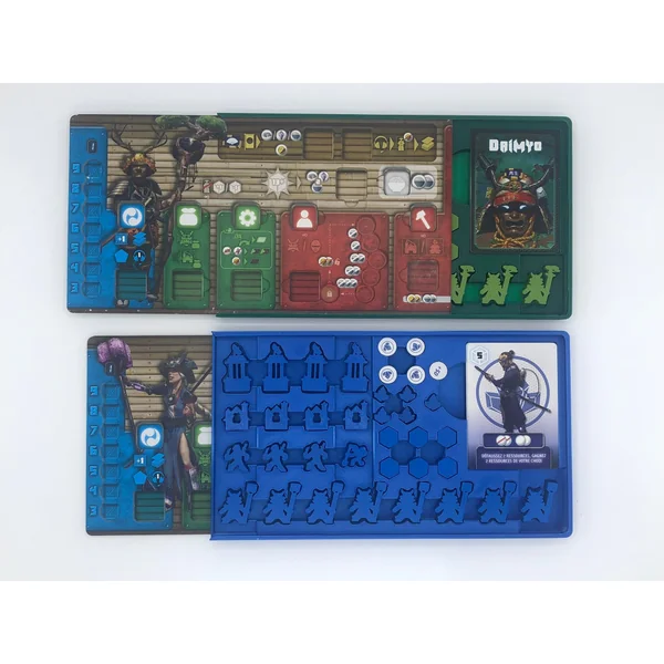 - 4 Boîtes individuelles amovibles pour chaque clan, colorées en bleu, vert, violet, et orange. Ces rangements accueillent tous les pions, jetons, et cartes nécessaires à un joueur pour la mise en place. Les plateaux de clan servent de couvercles pour les boîtes et s’intègrent parfaitement à l’intérieur de chacune.