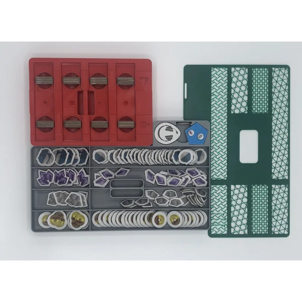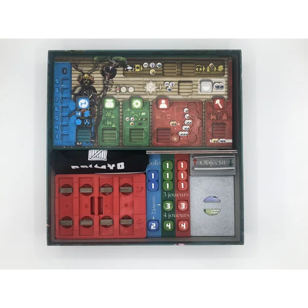- 1 bloc d’insert principal qui structure l’emplacement de tous les modules de l’insert. Il est conçu pour accueillir les plateaux de constructions, les cartes objectifs et contient également les dés, séparés par couleurs avec des indications en fonction du nombre de joueurs.