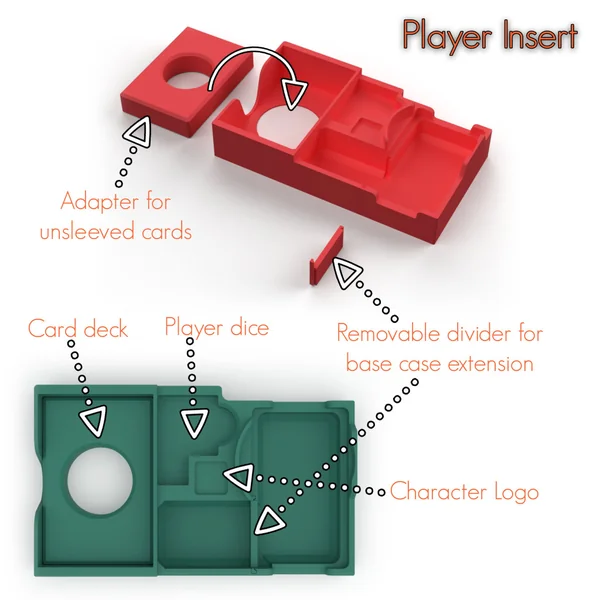 Chaque personnage dispose d’un compartiment individuel qui regroupe :- Ses cartes (compatibles sleeves grâce à un adaptateur amovible pour ceux qui n’utilisent pas de sleeves),