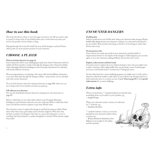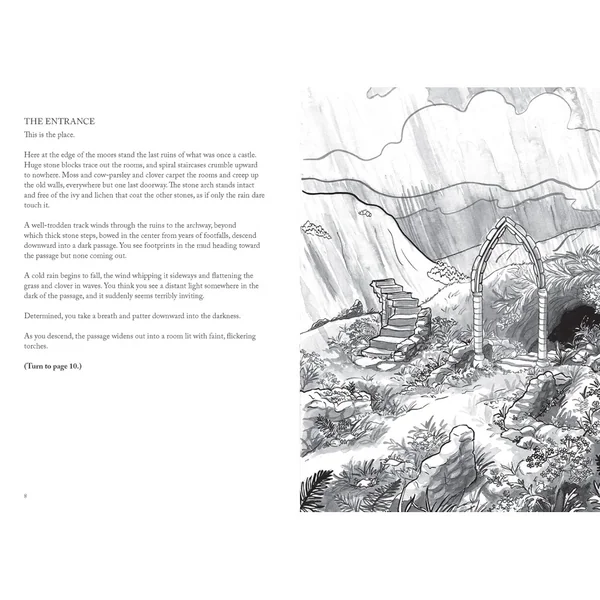 C’est le lecteur qui décide de la direction à prendre et de la manière d’explorer, avec des centaines de chemins différents à travers l’histoire. Sur certains chemins, vous trouverez des richesses inouïes, des artefacts anciens, des créatures étranges ou des passages secrets. Sur d’autres, vous vous en sortirez à peine vivant (ou vous mourrez de façon horrible).