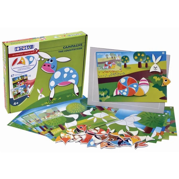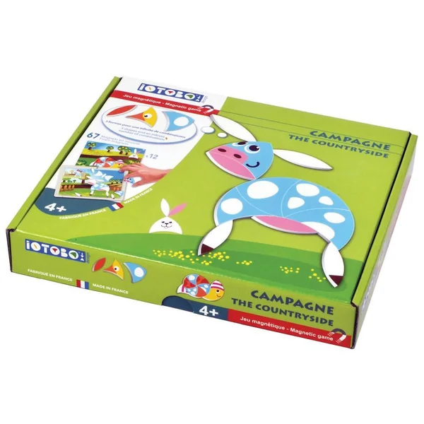 Vache, lapin, poney. Une Campagne très animée et colorée comme une promenade en été ! Des teintes vives, des magnets en grand nombre, 2 niveaux de jeu pour inventer une nature étonnante avec iOTOBO !