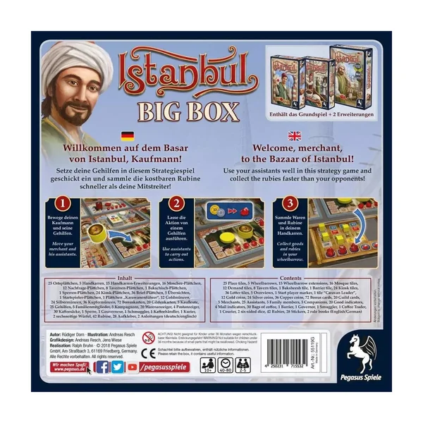 Istanbul Big Box est un jeu de société créé par Rudiger Dorn et édité par Matagot. Coffret complet du classique Istanbul, il est accessible dès l’âge de 10 ans pour des parties de 40 minutes. La mécanique principale est la gestion d’ouvriers.