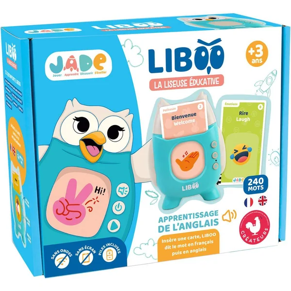 Liboo est une liseuse innovante et adaptée aux enfants dès 3 ans. Grâce à ses 120 cartes thématiques, elle permet de découvrir 240 mots en français et en anglais, répartis en 13 catégories telles que les animaux, les chiffres, les couleurs, et bien plus. Sans écran ni ondes, cette liseuse éducative favorise un apprentissage sain et interactif : il suffit d’insérer une carte, et Liboo prononce le mot en français, puis en anglais. Compacte et facile à utiliser, elle fonctionne avec 3 piles AAA incluses.