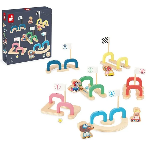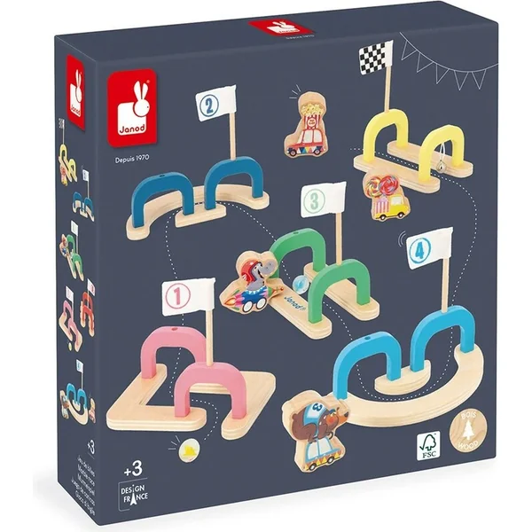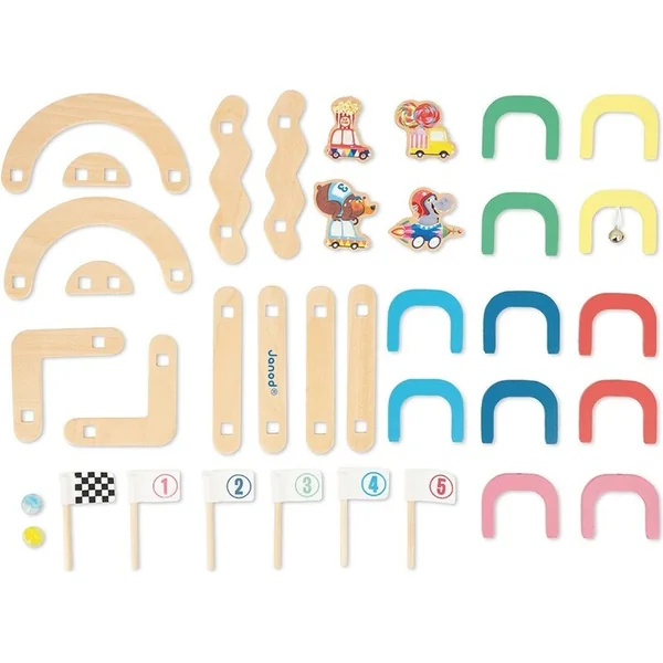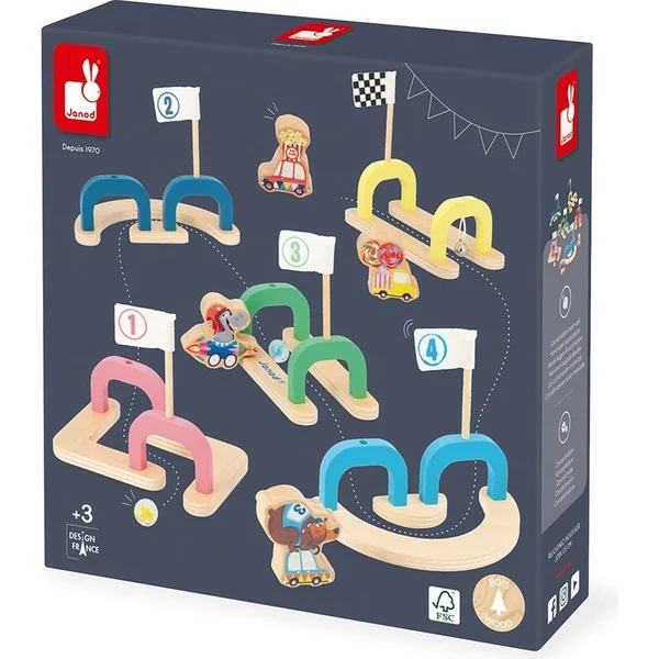 Cette piste d’obstacles comprend : 6 entrées et sorties colorées avec des drapeaux, 2 panneaux en verre et 4 jetons de véhicules en bois.