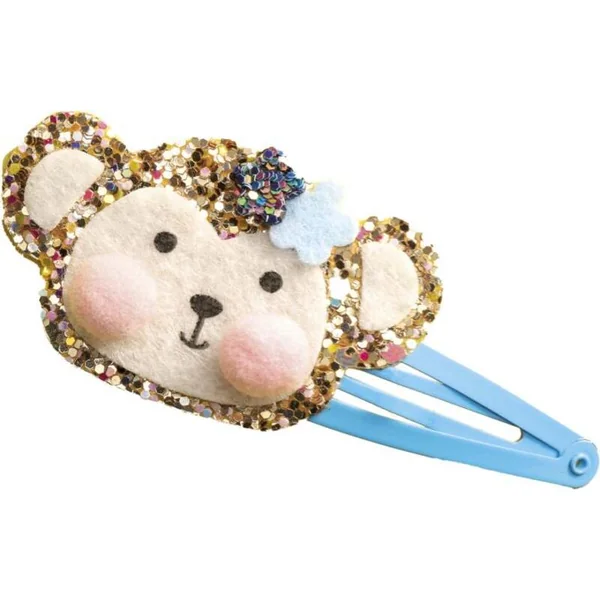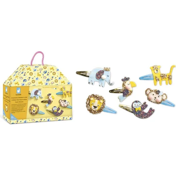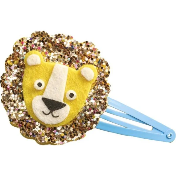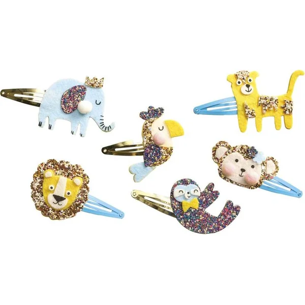 Allons dans la jungle ! Grâce à ce kit créatif, vous fabriquerez 6 barrettes à cheveux scintillantes avec des motifs d’animaux de la jungle : éléphant, lion, léopard, toucan, paresseux et singe.