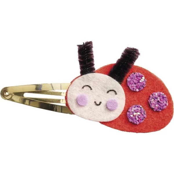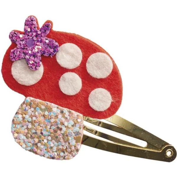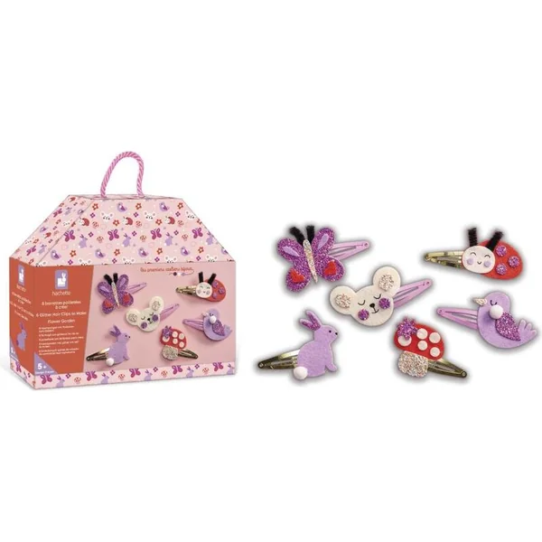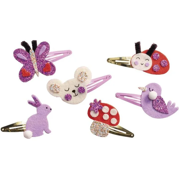 Jardin fleuri ! Avec cet ensemble créatif, vous pouvez fabriquer 6 barrettes à cheveux scintillantes sur le thème des habitants du jardin : un joli papillon, une coccinelle, un petit lapin, un oiseau, un champignon et une petite souris.
