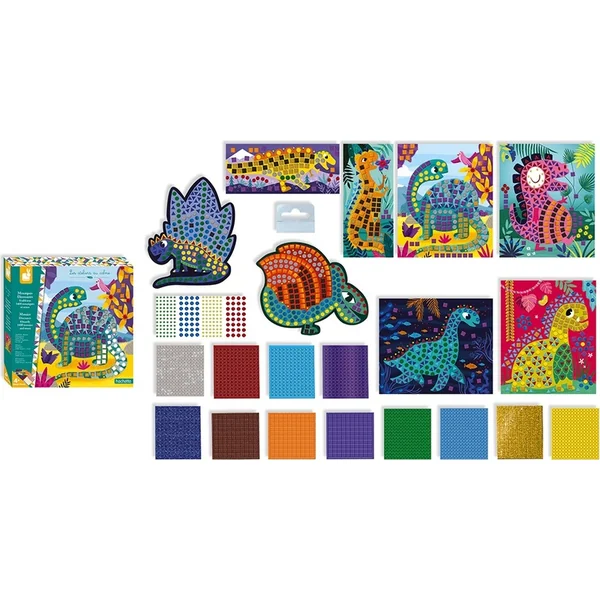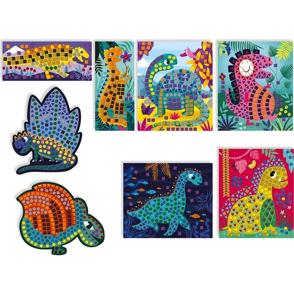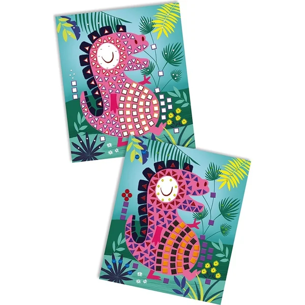 Le kit créatif de mosaïque Dinosaure Janod Atelier Maxi contient 8 cartes avec de beaux dinosaures et 12 feuilles de papier avec des mosaïques colorées.