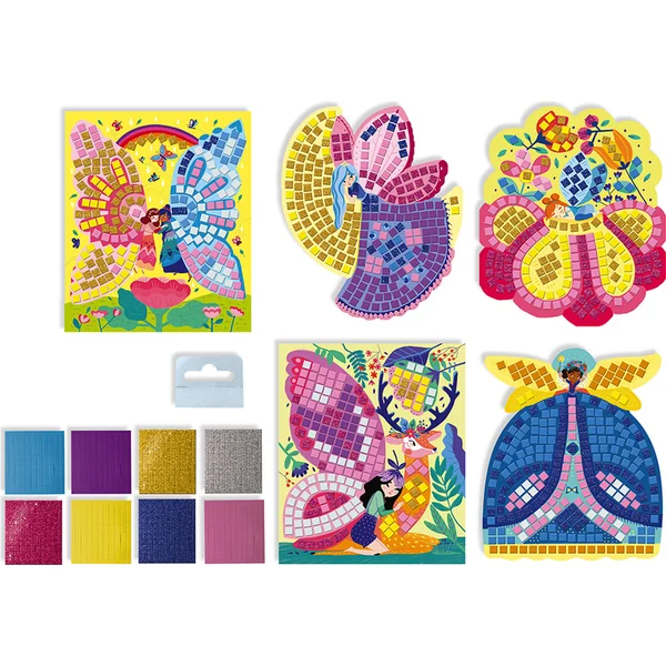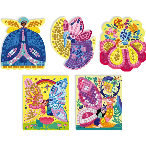 - Contenu : 5 tableaux avec des motifs de fées et d’animaux des bois et 1100 pièces de mosaïque, 5 crochets adhésifs et une brochure avec des modèles et des instructions.