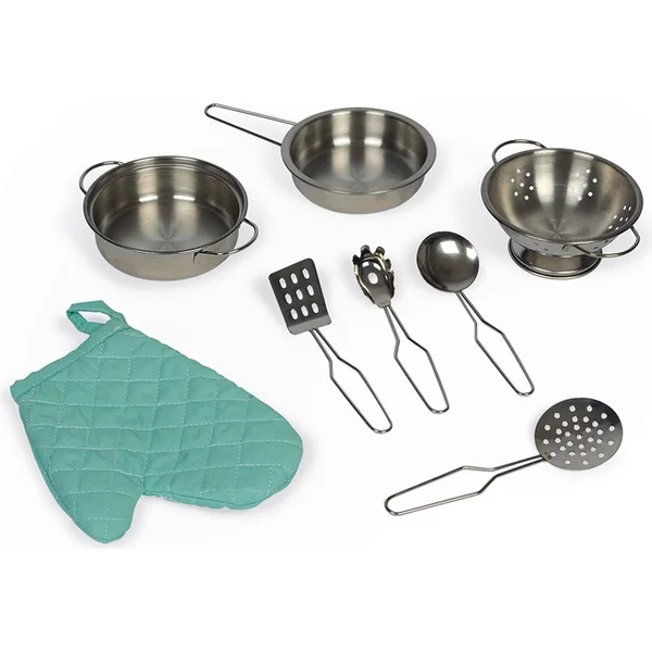 - La cuisine comprend également des accessoires pour le chef qui prend la cuisine très au sérieux : un tamis, une casserole, une poêle, une spatule, deux louches et un gant de cuisine. De l’autre côté de la cuisine se trouve une buanderie avec une machine à laver, des étagères intégrées et une horloge avec des aiguilles mobiles.