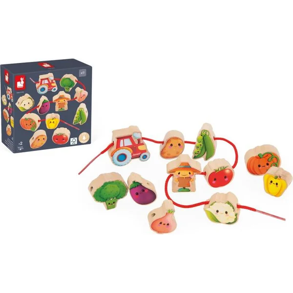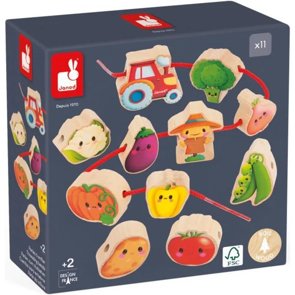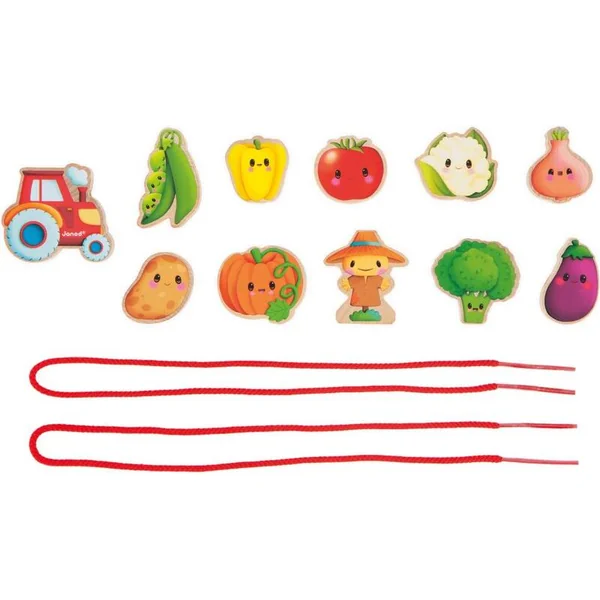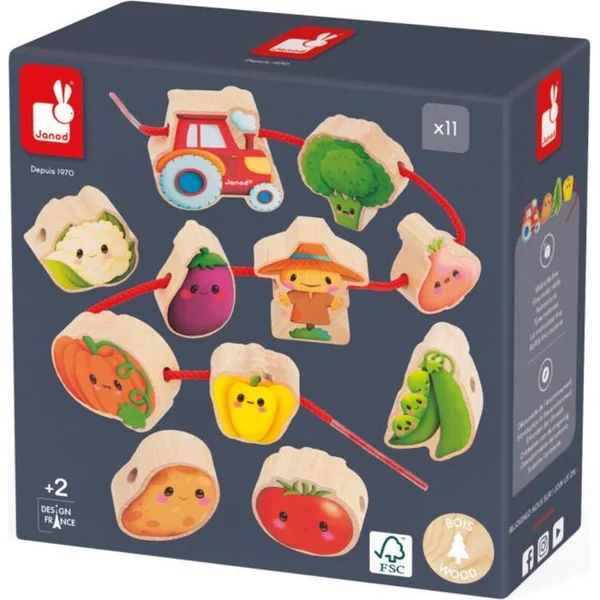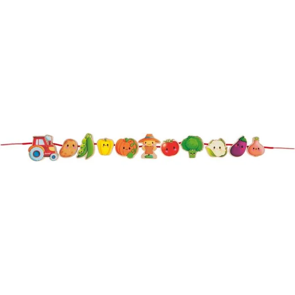 Le jouet se compose de 2 cordes et de 11 perles en bois sur le thème du jardin potager.